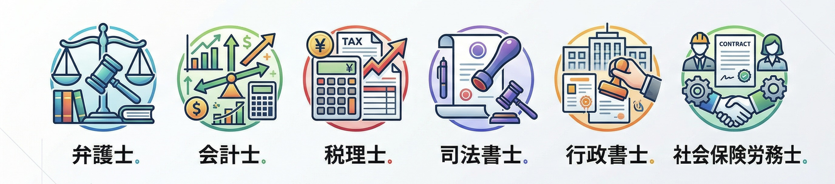 弁護士、会計士、税理士、司法書士、行政書士、社会保険労務士。