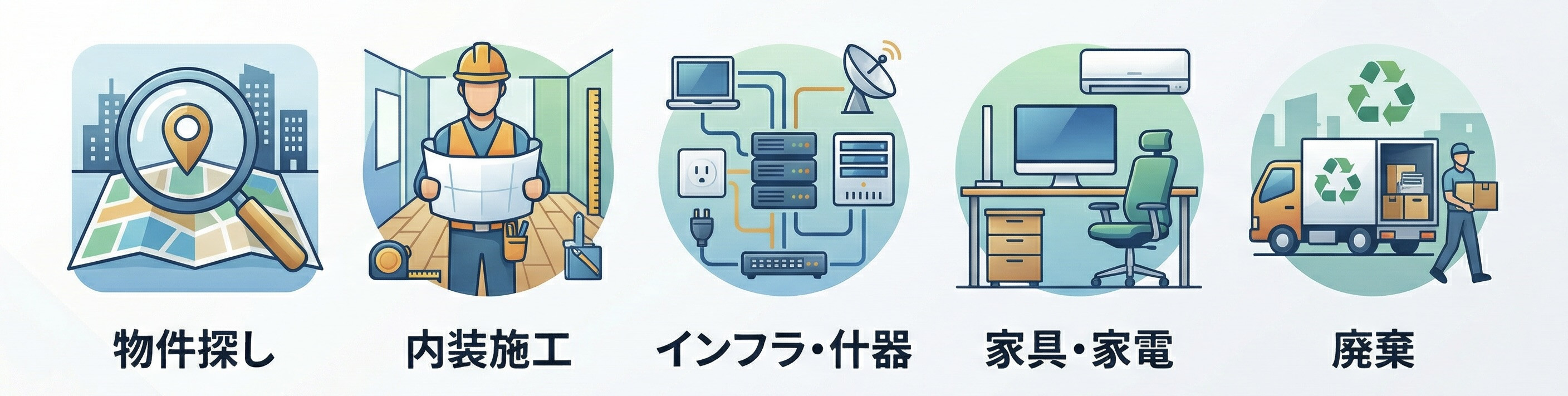 - 通信インフラ、電気工事、什器の配置